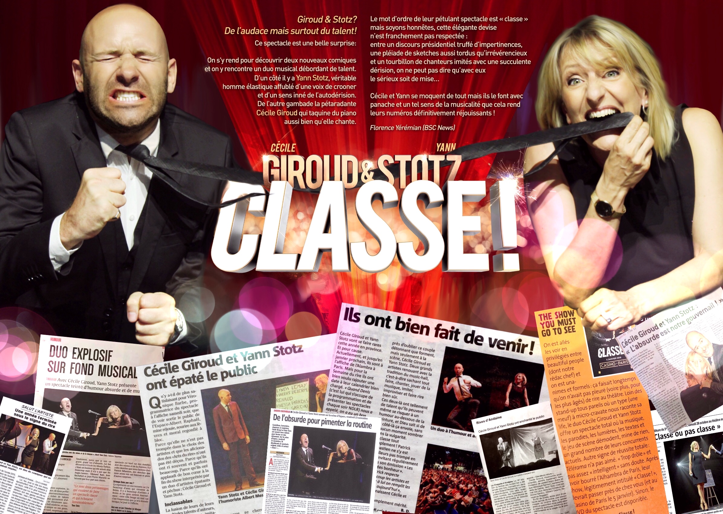 "Classe", un spectacle unique, enthousiasmant et indocile qui ne se réalise pas sans douleur mais qui reste digne quoi qu'il en coûte à ces surdoués de la comédie, du chant, du piano et du mime. On y croise avec beaucoup de tendresse et de réalisme Paradis, Renaud, Delerm, Lemay, Liza Minelli, Tony Benett et bien d'autres... Leurs talents multiples, multipliés par deux, sont unis pour créer un genre nouveau dans le paysage de la comédie le music-hall moderne. Inspirés par l'humour absurde des Monty Python, la rapidité des cartoons, l'exaltation de la chanson française et l'émotion du cinéma...