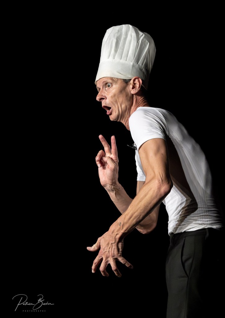 Au fil des 75 minutes du spectacle, Patrik aborde le côté clownesque de la vie. Un papa désabusé et maladroit que l’on rencontre chez lui, se transforme tour à tour en Roméo prêt à conquérir le cœur de sa douce Bernadette, en chef d’orchestre pour une symphonie du silence, en pâtissier un tantinet facétieux, en « père-poule » un peu dépassé, sans oublier l’hilarante mante religieuse… Et ce sans aucune parole. Seul sur scène, le mime bruiteur réussit à matérialiser un monde imaginaire où l’on se surprend à « voir » l’oiseau qui s’enfuit, le chien qui attaque ou le gâteau qui flambe. Tout en humour et en finesse, cet univers peut être tout aussi attendrissant qu’extravagant mais ne tombe jamais dans le piège de la caricature facile.