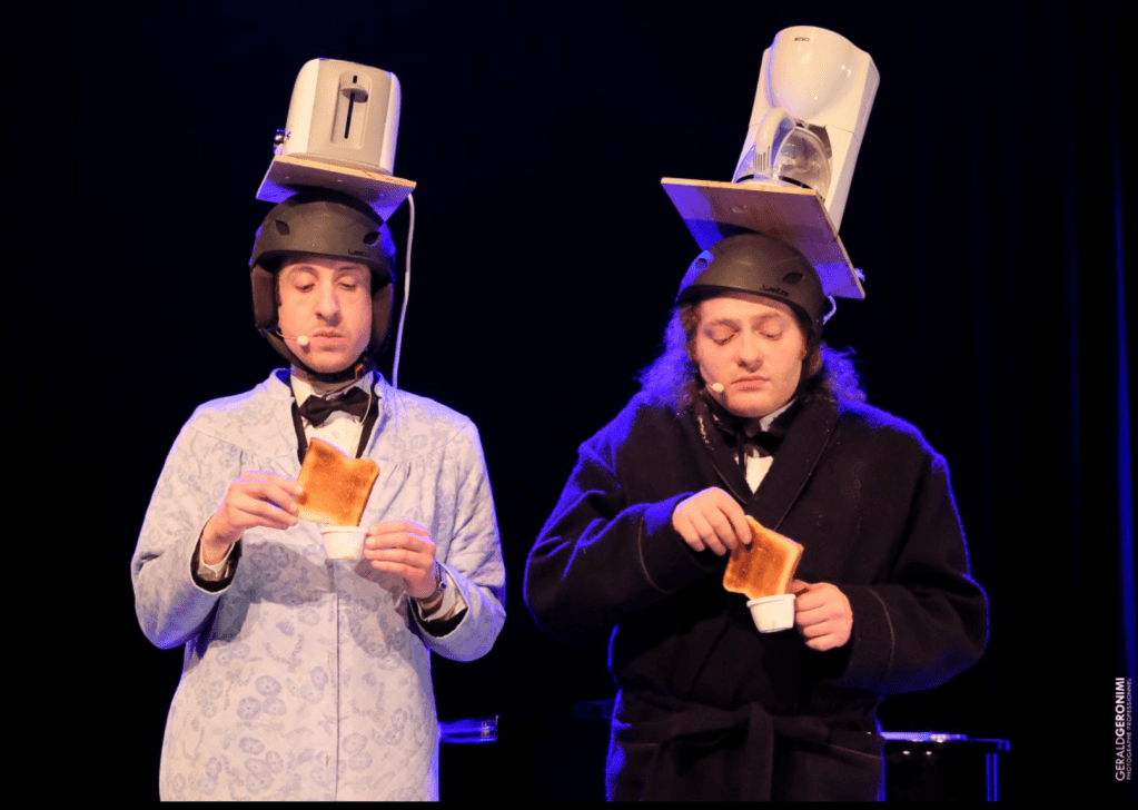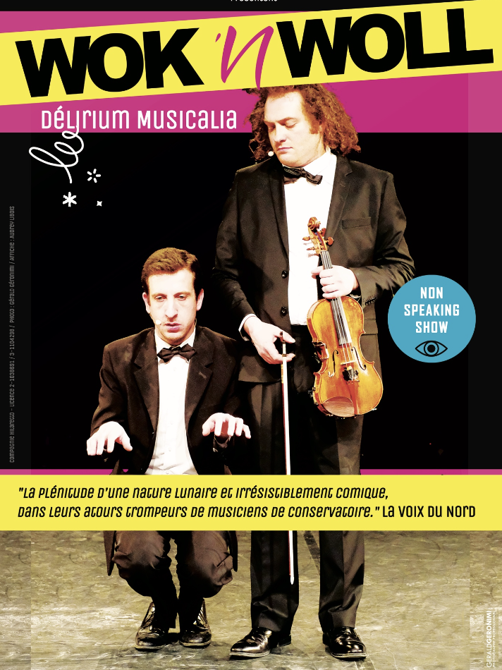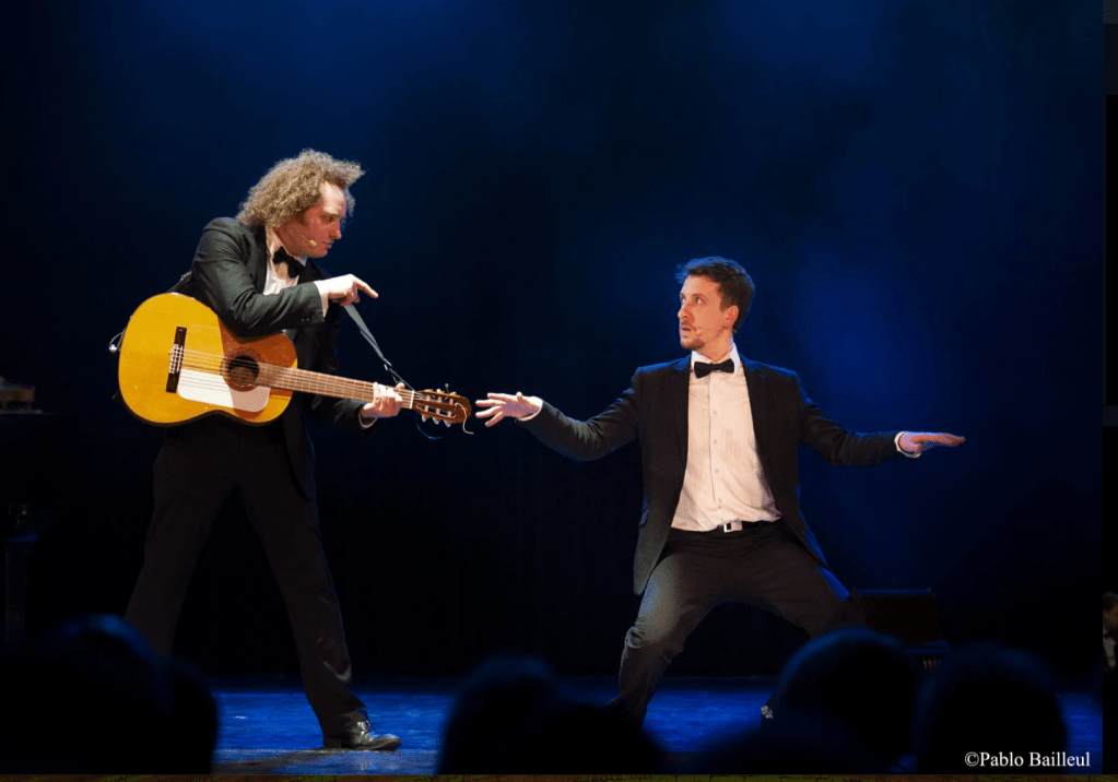 Un véritable cartoon mélodieux présenté par des musiciens aussi virtuoses qu’hilarants ! Un spectacle musical clownesque qui ose mêler les grandes œuvres classiques aux Gipsy-Kings, Elvis, les Rolling Stones ou AC/DC avec pour toile de fond un rapport burlesque irrésistible. Deux musiciens géniaux qui maitrisent parfaitement leurs instruments et nous bluffent complètement par leurs performances.